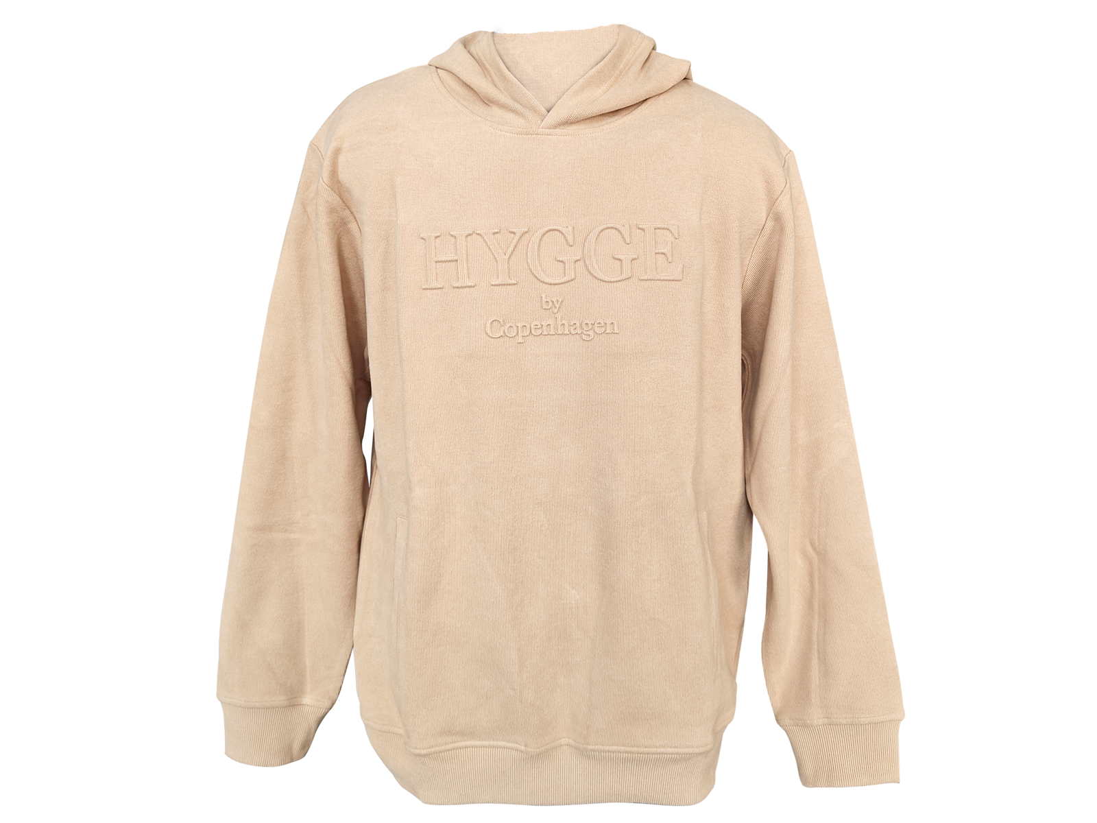 Beige hoodie med præget HYGGE-motiv i GRS-certificeret bomuld. Et salgbart valg til detail og turisme med fokus på dansk kultur og bæredygtige tiltag. Læs mere under ”Information”.